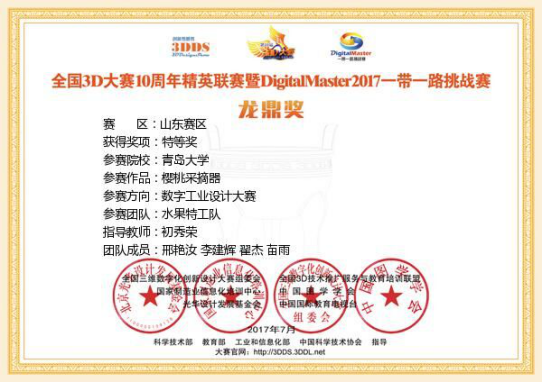 6月10日至20日,全国3D大赛10周年精英联赛暨DigitalMaster2017一带一路挑战赛省赛拉开帷幕。应用技术学院代表队在指导老师初秀荣的带领下,15级机械工程专业邢艳汝、李建辉、翟杰、苗雨设计的“樱桃采摘器”最终获得山东赛区省赛特等奖。来自全国的各所高校共1000余个代表团队的参赛选手参加了此次大赛。大赛包含数字工业设计大赛、数字人居设计大赛、数字文化设计大赛等分项竞赛。